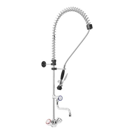 De voorspoel-douche met kraan is een essentieel hulpmiddel in professionele keukens, ontworpen om efficiëntie en hygiëne te bevorderen. Deze robuuste installatie combineert een krachtige voorspoel-douchekop met een flexibele slang en een stevige kraan, waardoor het een veelzijdige oplossing biedt voor het snel en grondig reinigen van serviesgoed, kookgerei en werkoppervlakken. De voorspoel-douche is uitgerust met een ergonomische handgreep die comfortabel in de hand ligt, waardoor langdurig gebruik zonder vermoeidheid mogelijk is. De krachtige waterstraal van de douchekop verwijdert moeiteloos hardnekkige voedselresten en vet, wat de afwastijd aanzienlijk verkort en de efficiëntie van de keukenmedewerkers verhoogt.